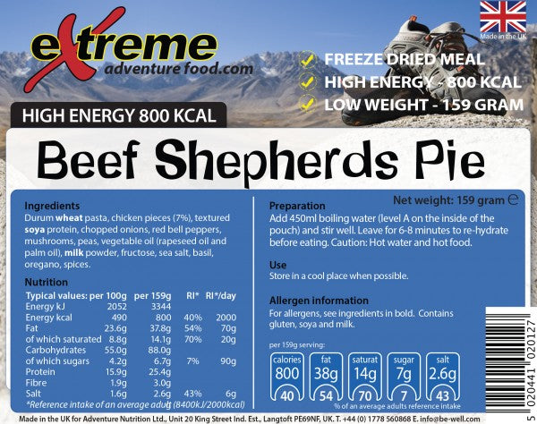 Our very popular Beef Shepherds Pie now in our High Energy and Low weight, Extreme Adventure Food range Just 161g for 800 Kcal