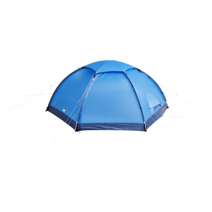 Spacious and stable dome tent with two generous vestibules. A lightweight and comfortable trekking tent for four-season use, in all conditions except the most exposed. Two entrances simplify tent life, you can organise one side each inside the tent and use the lee-side entrance in windy weather. There is also plenty of space for equipment, cooking and activities when the weather is bad. The inner tent and flysheet are raised together. The three-pole construction makes the tent self supporting and easy to pitch anywhere – use the guylines to anchor it in place and make it totally stable in the wind. The pole sleeves are colour coded for simplicity and dimensioned so you can use double poles (an accessory) in exposed conditions. The tent has a comfortable sitting height and a good area for socialising. There is a detachable mesh shelf in the inner tent and several mesh pockets for storing gear. Large entrances with extra-fine mosquito netting allow you to admire the view from your sleeping bag without the intrusion of insects. Closable ventilation openings at different heights give the best possible airflow. This, together with the possibility of fastening the outer door in a half-open position, makes the tent an excellent choice in tropical climates. The flysheet is made from Fjällräven’s new high-performance TripleRip nylon and an innovative construction that combines two different fabric weights – 20 denier in the top part and 40 denier at the bottom where abrasion is most intensive – giving excellent strength despite low weight. Just like all of Fjällräven’s tents, Abisko Dome 2 is made entirely without PVC plastic and toxic flame retardants, and its impregnation is fluorocarbon free.