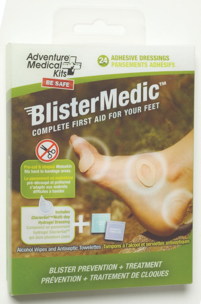 The Blister Medic is the best of both worlds, combining the tried-and-true protection and blister prevention of Moleskin with the advanced relief and healing of Glacier Gel™ hydrogel dressings. Alcohol pads for skin preparation and antiseptic towelettes for wound cleaning round out the package.