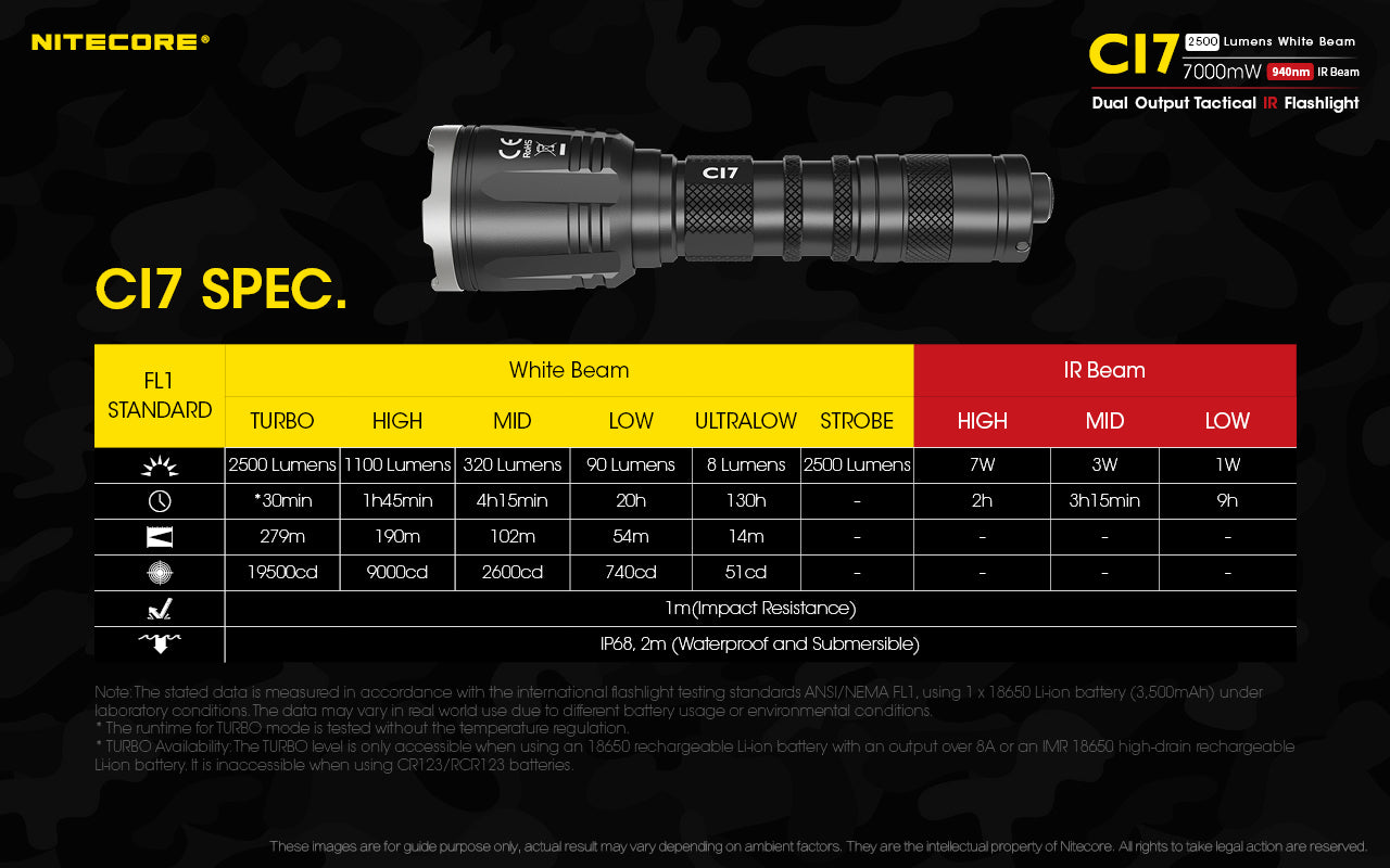 Nitecore's new CI7 is an absolute beast of a flashlight, featuring a dual output design of IR and white light beams. IR lighting works together with night vision devices or IR cameras to perform stealthy operations, such as search and rescue or hunting. So why carry around separate IR and white flashlights when you can bundle them together? You won't find any compromise here- the 7000nM IR turbo is supported with 4 x SST-10-IR LEDs, while the 2500 lumen white beam utilizes 4 x CREE XP-G3 S3.