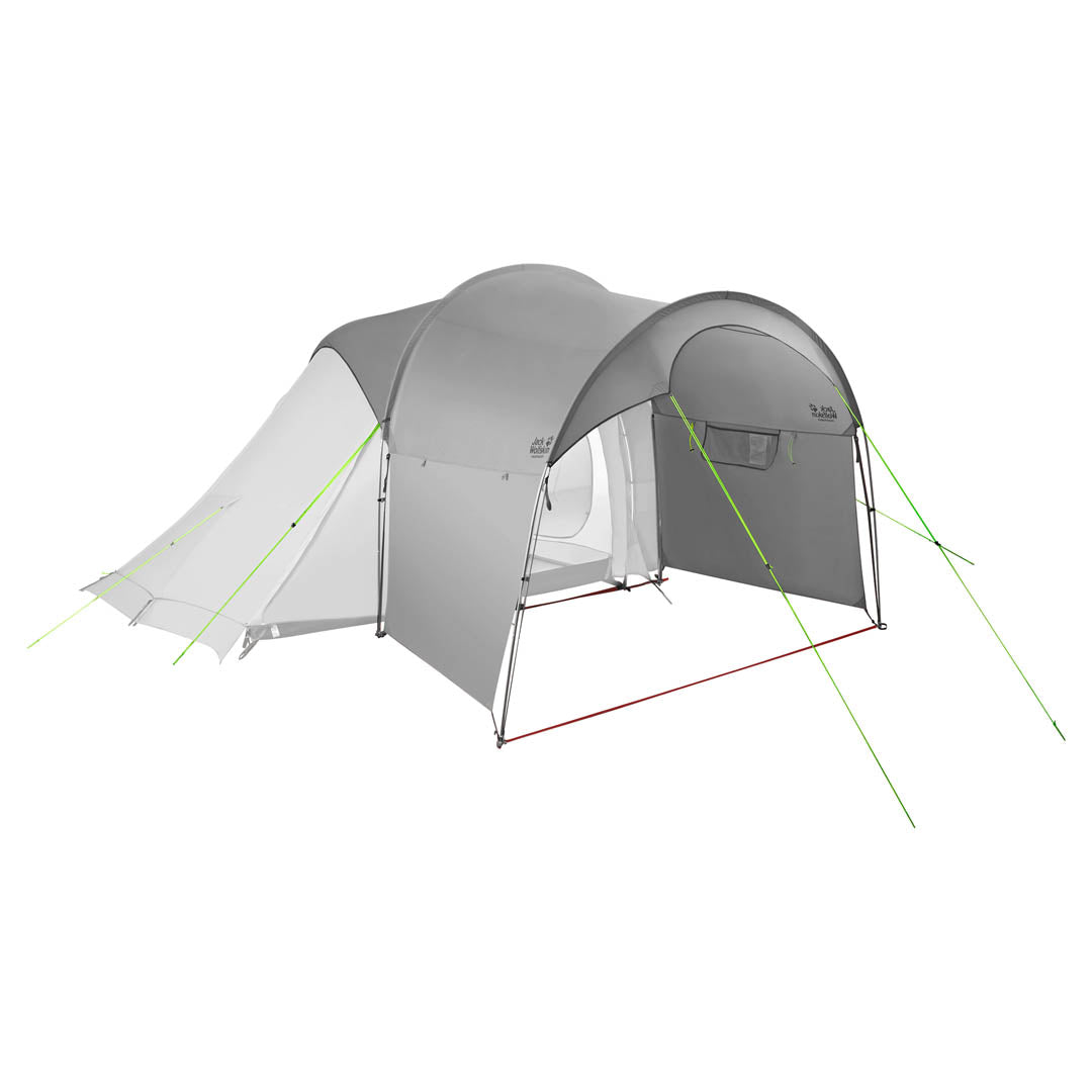 It effectively creates an extra, standing-height vestibule for your tent and increases the roofed living area by seven square metres – enough space for a dining area, kitchen or bike storage. It comes with two long poles and several guylines and is very easy to rig.