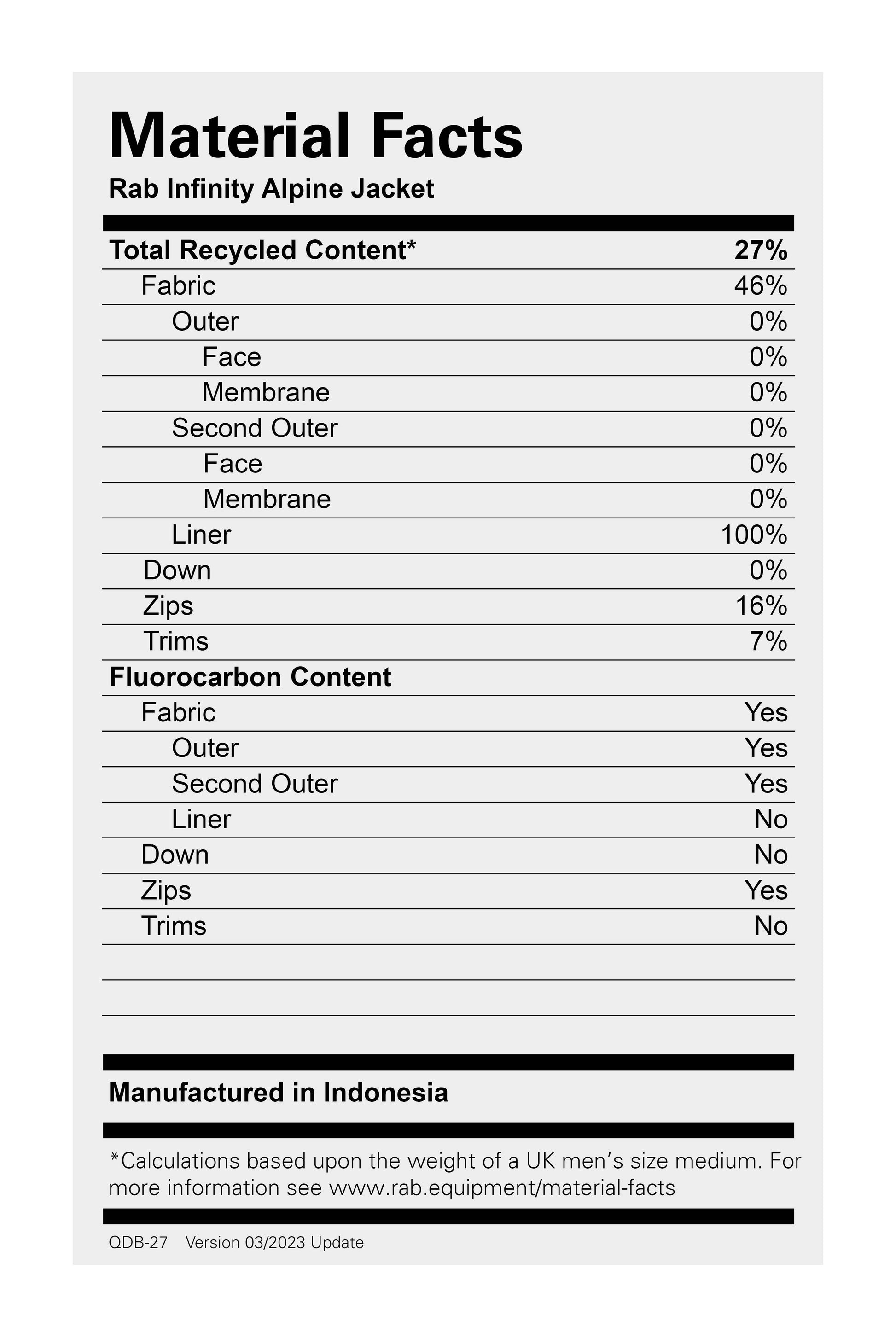 Extremely lightweight for this level of warmth and protection it can compress down easily. It has a fully adjustable, helmet compatible, down-filled hood with a stiffened peak for increased protection and a two-way YKK® VISLON® front zip for ease of use with a harness. Designed to excel on vertical missions the Infinity Alpine has articulated sleeves for complete mobility, adjustable cuffs for use with gloves and multiple pockets.