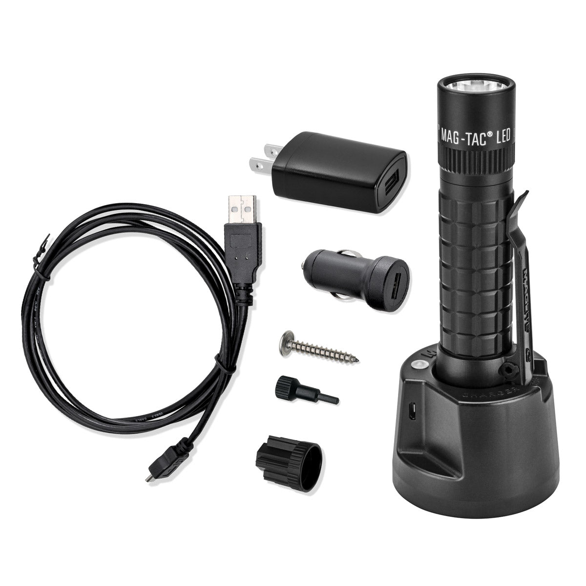 An advanced lighting tool powered by a high capacity Lithium Iron Phosphate (LiFePO4) rechargeable battery engineered for long service life with a 2.5 hr. charge time. Along with superior build quality and performance, this plain-bezel version of the MAG-TAC LED rechargeable flashlight comes with a detachable pocket clip and a USB powered mountable charging base. The charging base can be powered by the included 12V adapter or 120V converter, or by any other charging source that complies with the USB 2.0 Standard. Also, 4 Functions selectable through Mag Instrument's tailcap-switch-activated "Quick-Click" mode selector. Momentary, Full Power - 671 Lumens @ 1 hr. runtime, Power Save - 22 Lumens @ 18 hr. runtime, & Strobe.