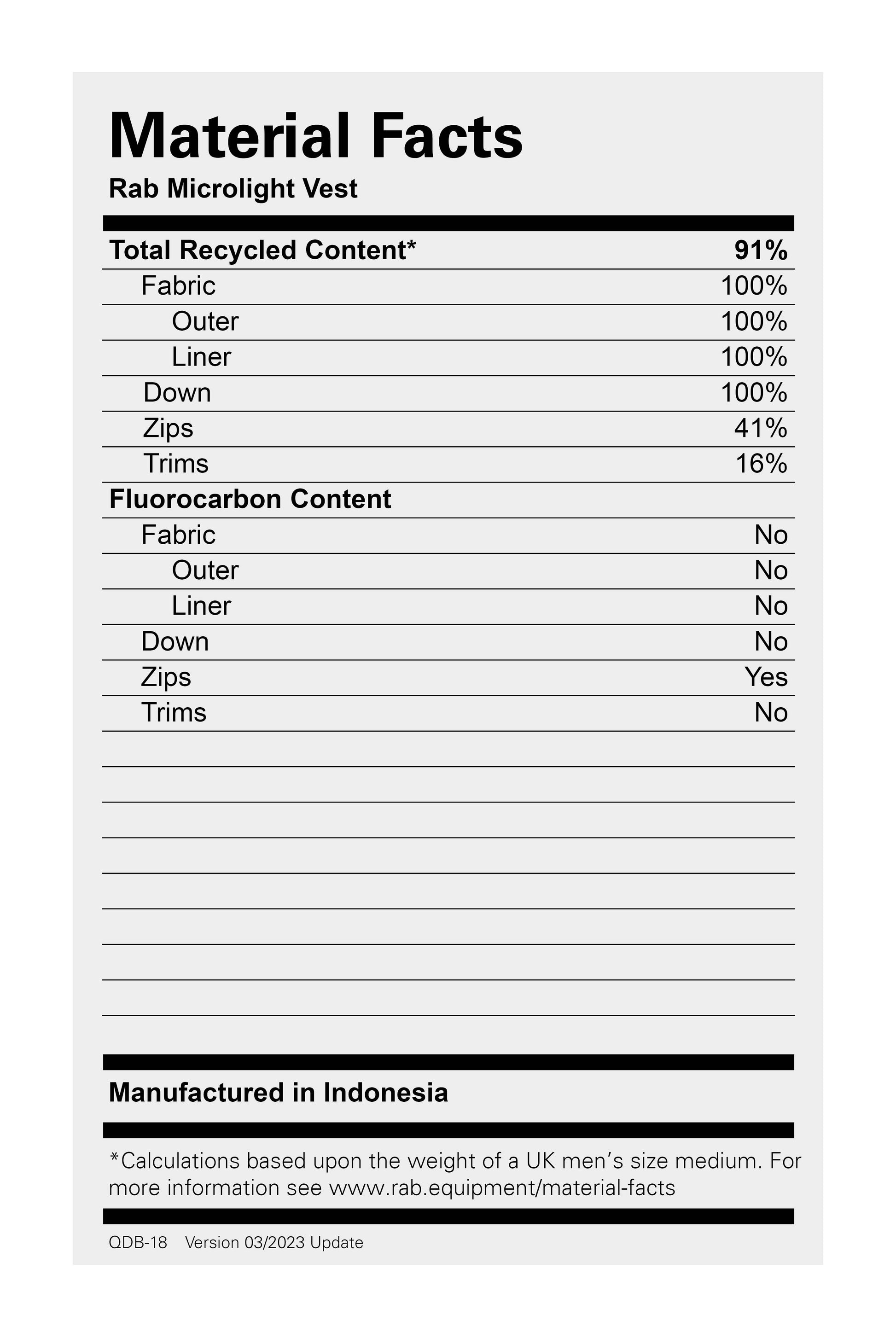 - Main Fabric: Recycled 30D nylon Pertex Quantum, 50g/m², with DWR