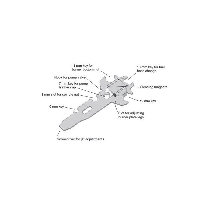 Service functions: 11 mm key for burner bottom nut, 10 mm key for fuel hose change, hook for pump valve, 7 mm key for pump leather cup, 8 mm slot for spindle nut, 6 mm key, screwdriver for jet adjustments, cleaning magnets, 12 mm key, slot for adjusting burner plate legs