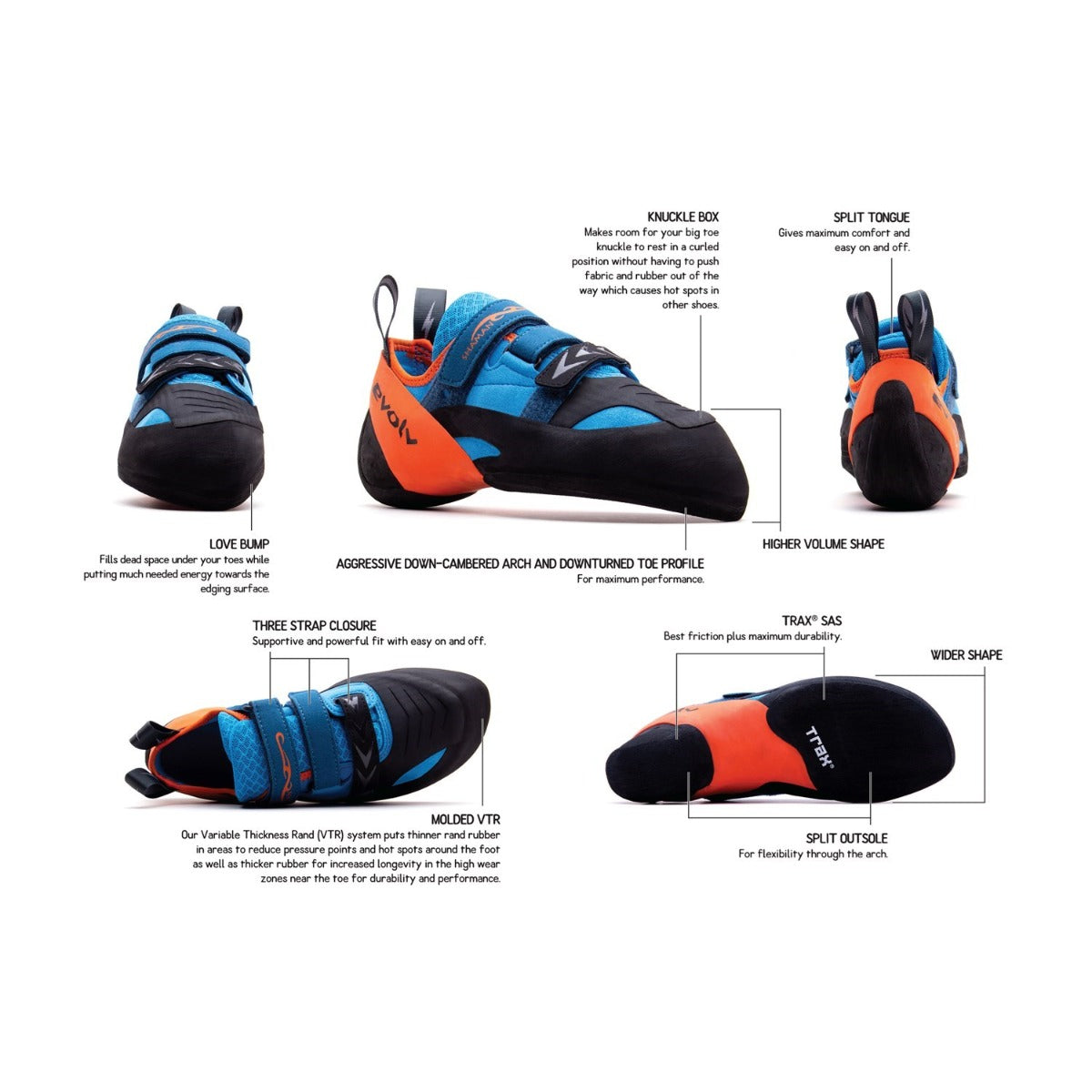 Building off the legacy of the original, the newly redesigned Shaman has an improved fit in terms of engineered comfort and performance with more toe rubber for toe hooking and an inset front strap for better medial side toe scumming. The "Love Bump" and "Knuckle Box" Technology creates the perfect downturned toe fit for powerful edging, pulling and toe hooking. Enjoy the legendary performance with next-level comfort.