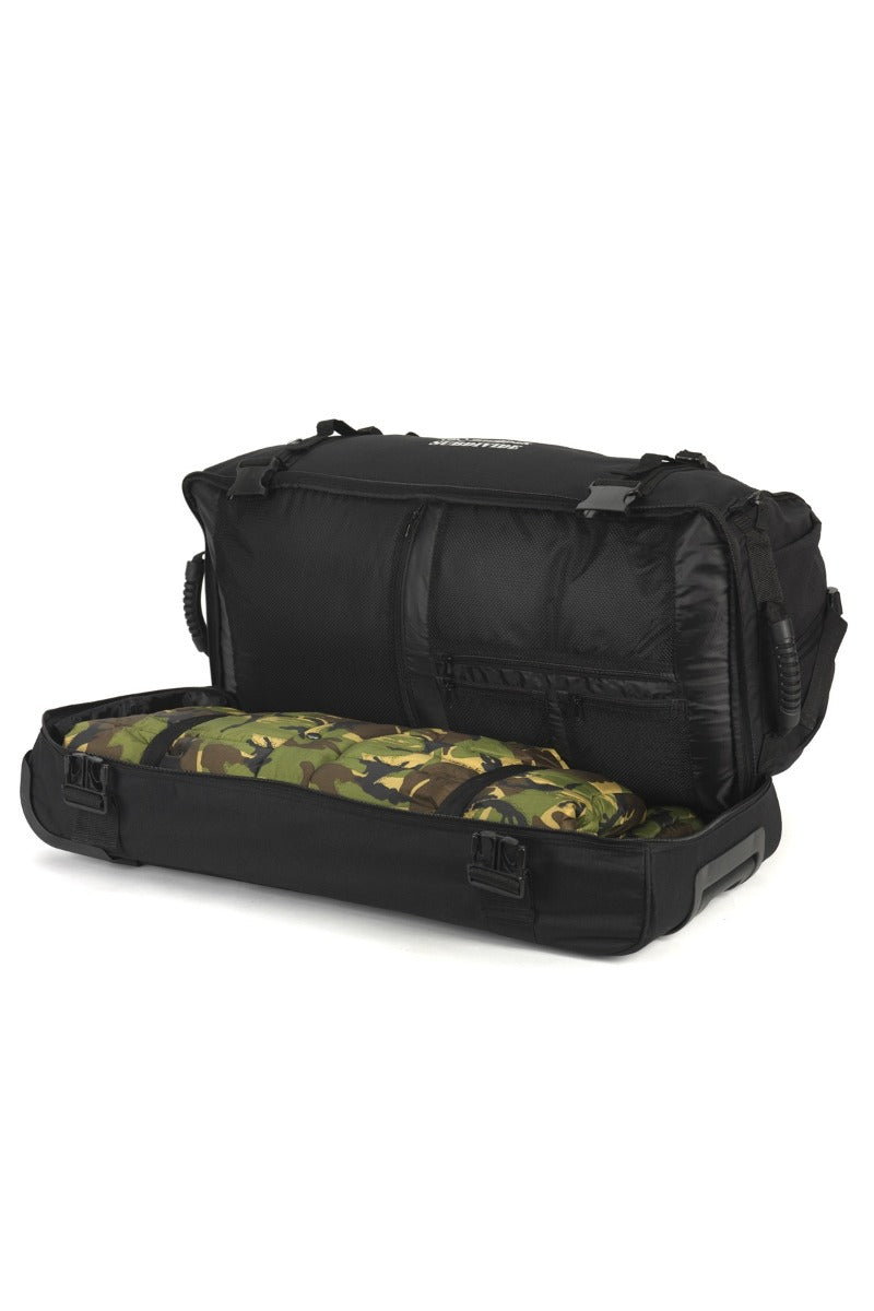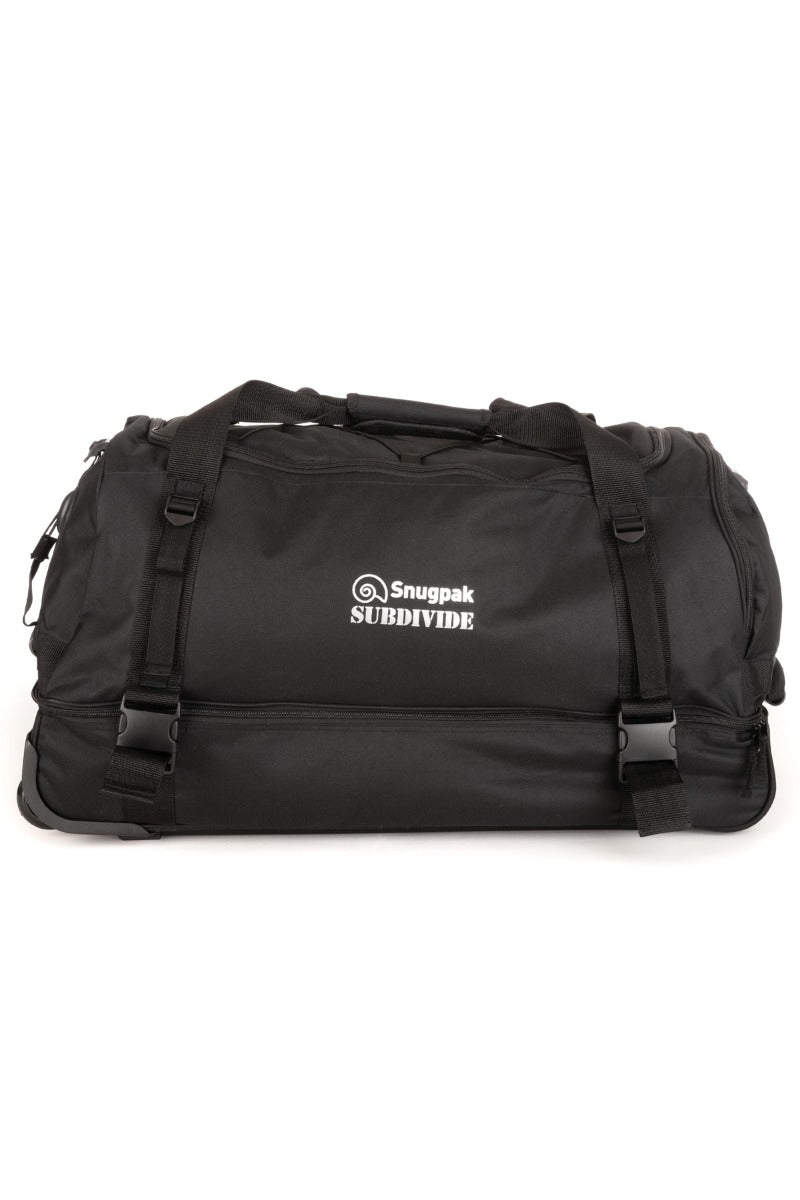 The Subdivide Roller is our most versatile carry all yet. It features two main compartments plus an organiser section, and quickly converts from a bag to a roller, with durable wheels and a retractable handle, when you need it. The lower compartment is roomy, with a heavy duty base to protect your belongings. It has straps to secure items down plus useful zip pockets on the underside of the upper compartment.