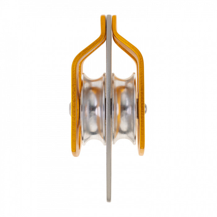 Highly efficient double pulley with swivelling side plates thanks to a ball bearing mounted sheave.