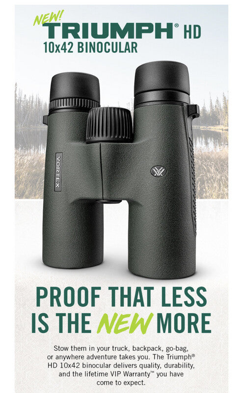 Triumph® HD binoculars deliver solid performance for outdoor enthusiasts and hunters who value quality gear. Stow them in your truck, backpack, or go-bag. Together with the built-in reliability Vortex® is known for, this binocular offers impressive image quality, sharpness, light transmission, and ergonomics thought reserved for only for elite gear.